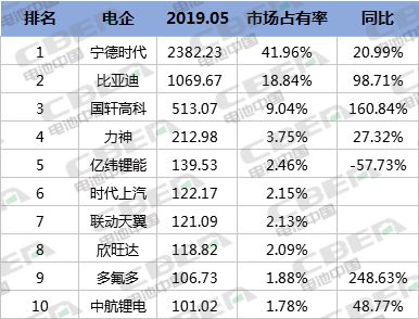 2019年5月动力电池企业TOP10排名(数据来源:动力电池应用分会研究部)