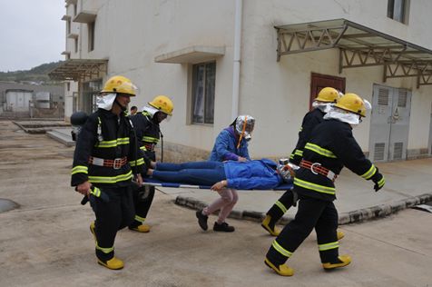 应急消防队进入火场搜救被困降压站工作人员,将伤者迅速转移到安全地带。