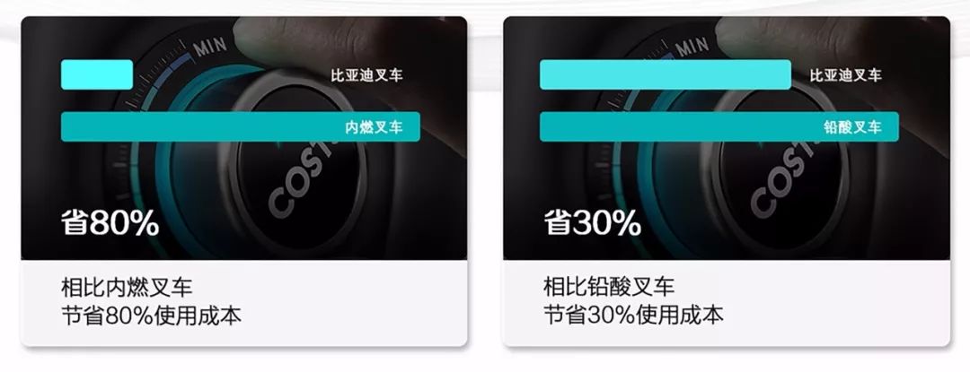 另经实际统计分析,比亚迪叉车的综合工况使用成本,相比内燃叉车可节省达80%、相比铅酸电池叉车可节省达30%,为客户大大节省了物流搬运成本,是一款真正意义上的绿色搬运产品。