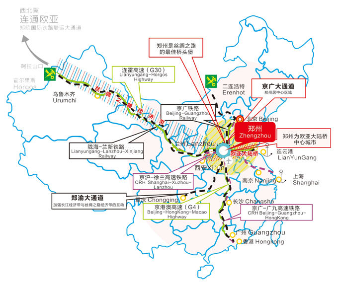 河南地处链接东西、贯通南北的战略枢纽,在全国交通和物流布局中居于重要地位,承担着东西经济互补、南北资源流通的重要使命。郑州是“一带一路”节点城市,国家中心城市,国际综合枢纽城市,国际物流中心城市,郑州具备打造融铁路、公路、航空等为一体的大型综合枢纽优势,依托中国(郑州)跨境电商综合试验区发展跨境商贸新模式,加上已开通运行的郑欧班列和不断加密的空中航线,郑州正显示出其独特的大交通、大枢纽、大产业发展远景,前途光明。