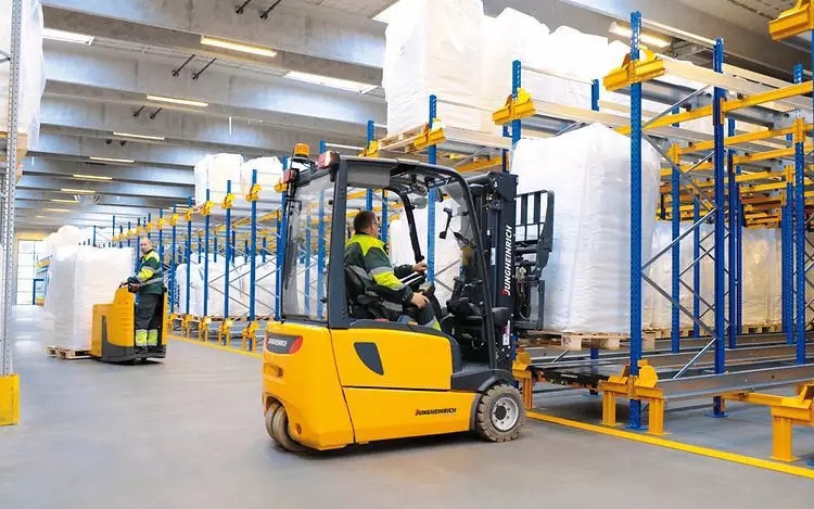 叉车是我们完整解决方案的一部分。几辆ERE 225电动托盘搬运车负责堆垛和拣选,最终将货物运输到紧凑型存储系统中。由于平台固定,它们可以达到每小时超过12公里的速度。这意味着货物可以非常有效地运输。