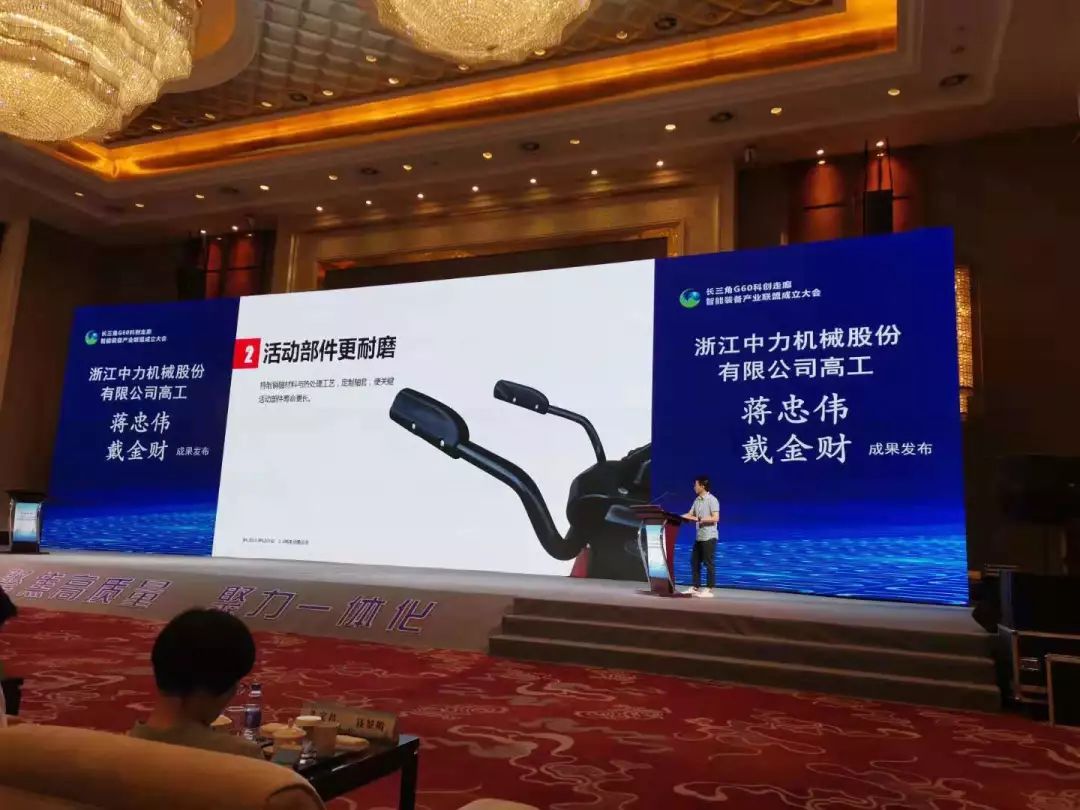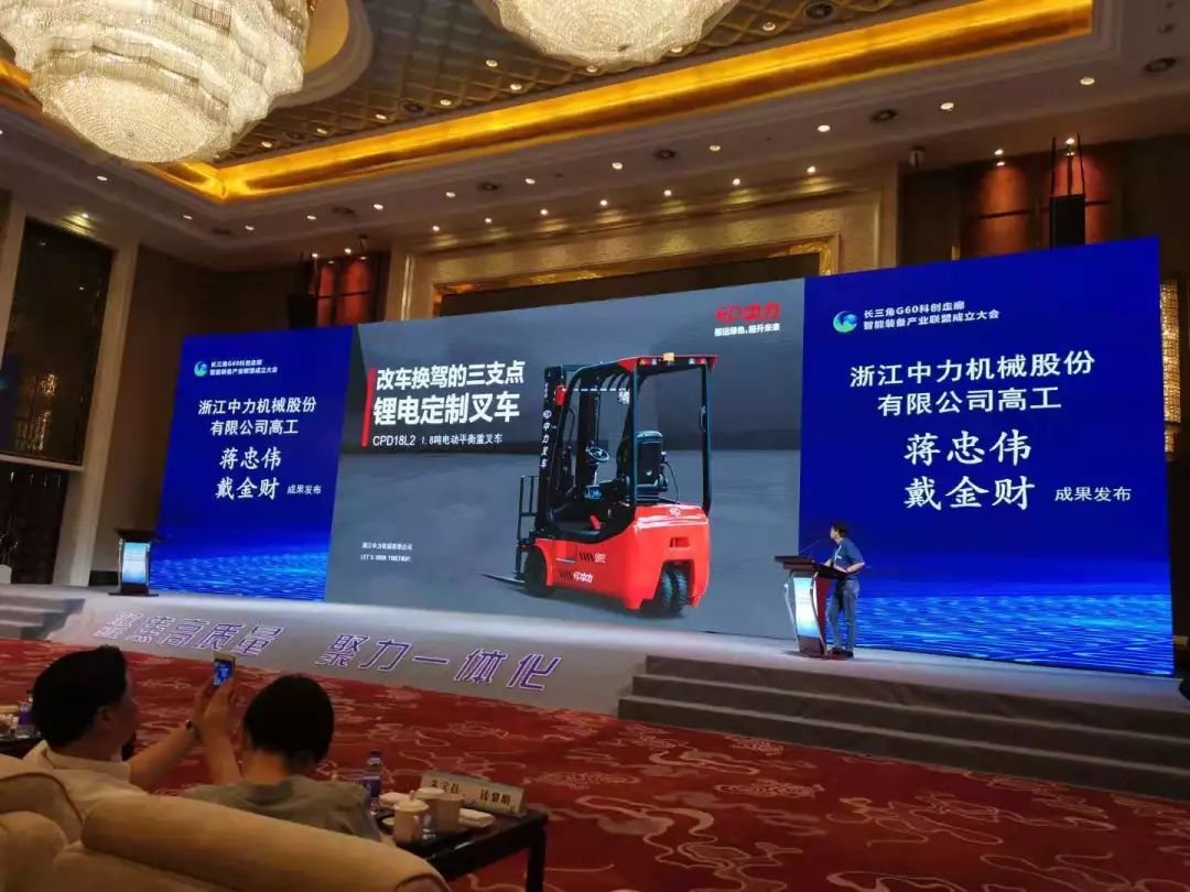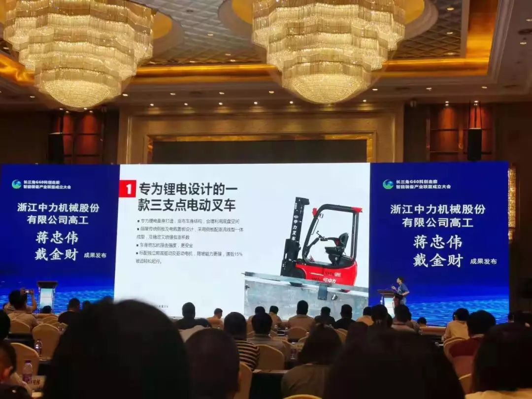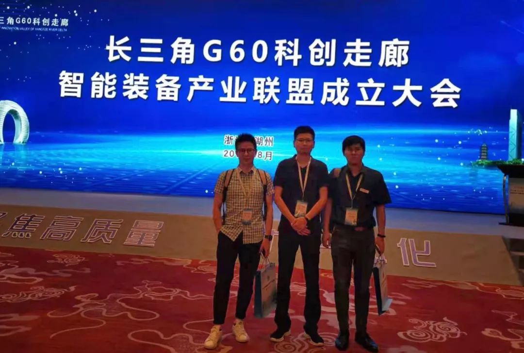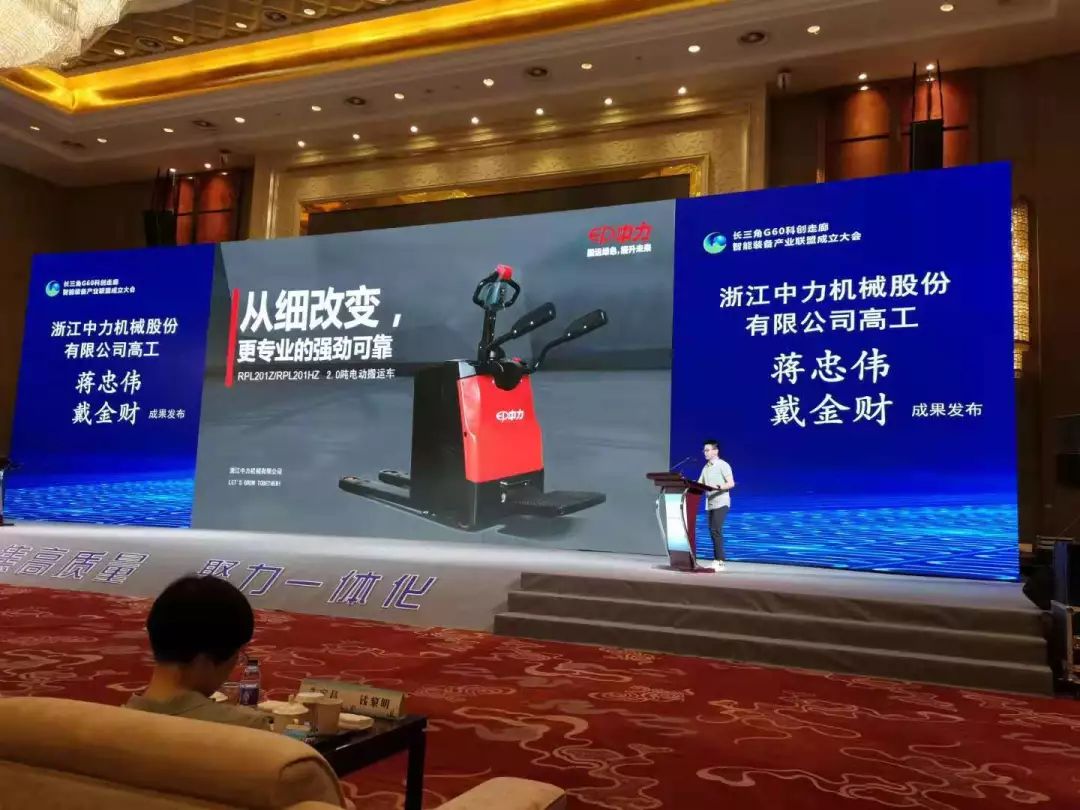 中力总助贺总、高工余工应邀出席,工程师蒋工与戴工在G60科创走廊智能装备产业联盟成立大会上展示并发布中力2019创新产品成果。
