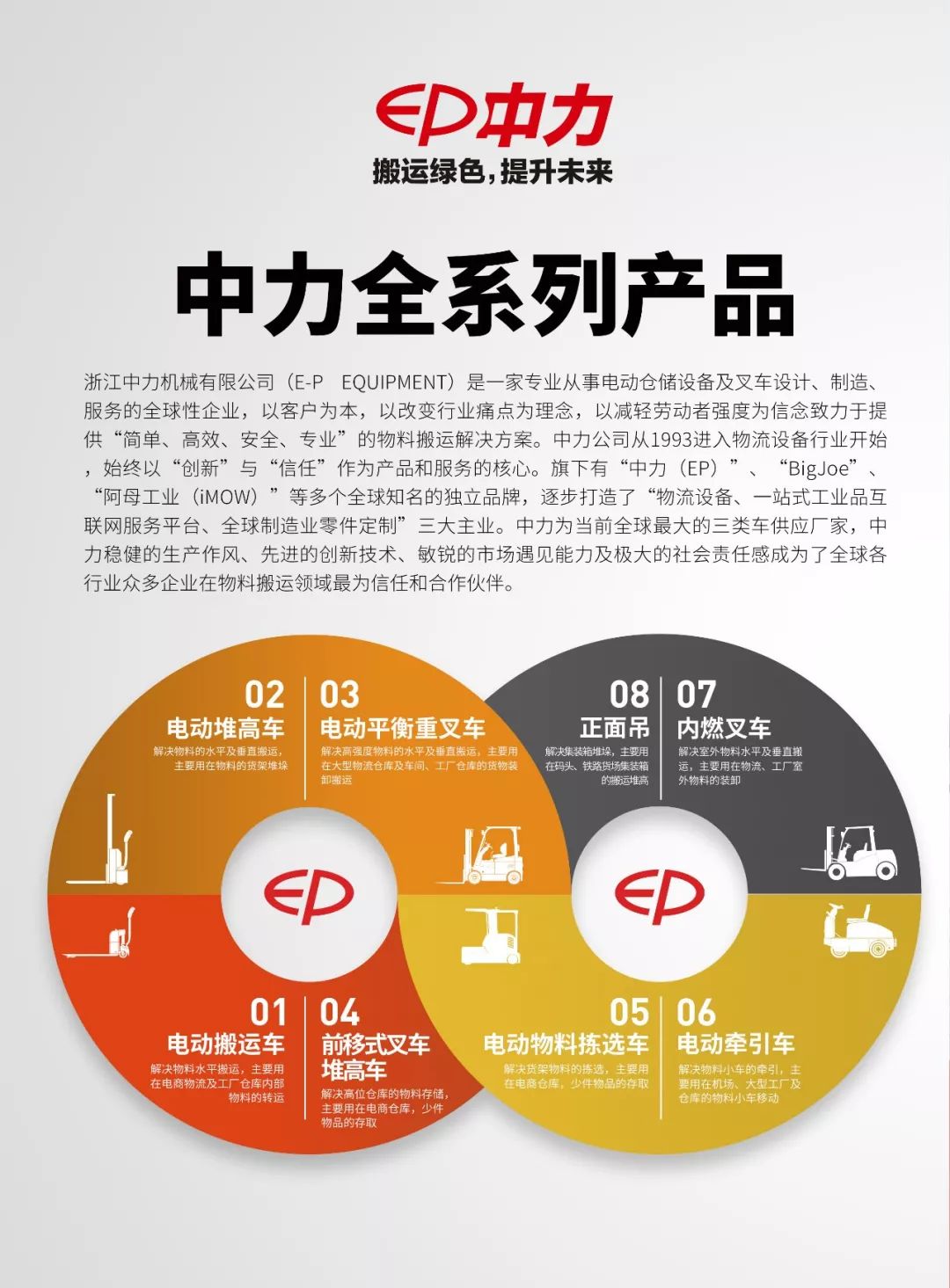 杭州中力搬运设备有限公司为浙江中力机械股份有限公司下属全资子公司,浙江中力机械股份有限公司(EP EQUIPMENT) 是一家靠产品驱动发展、创新引领变革,旨在打造工业物流4.0的全球化科技企业,专业从事电动仓储设备、智能搬运机器人及叉车开发、制造及服务。