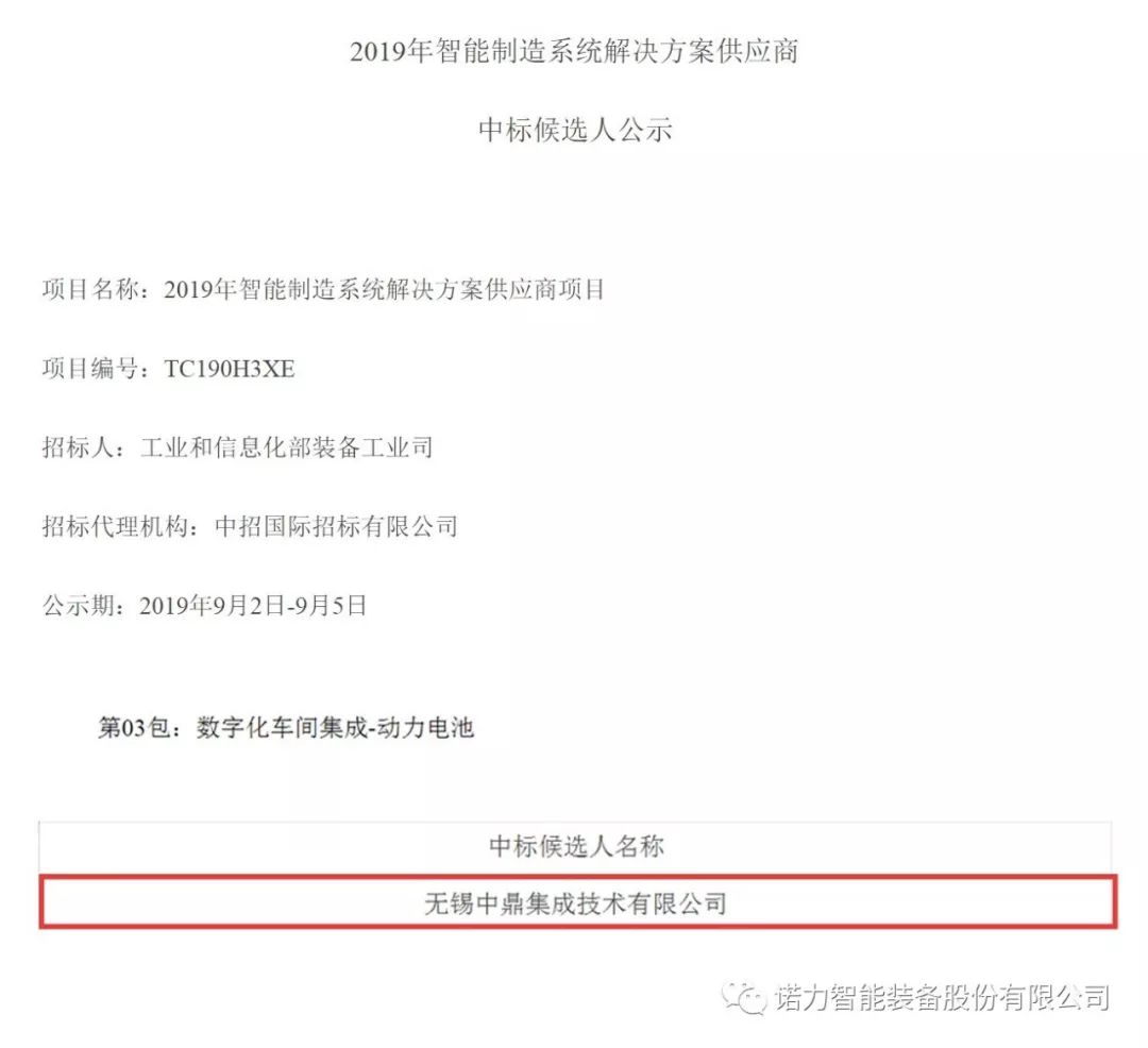 9月5日,国家工业与信息部装备工业司《2019年智能制造系统解决方案供应商》公示完成,诺力股份子公司无锡中鼎集成技术有限公司成功入选“数字化车间集成-动力电池”项目包,此批全国共有58家企业入选。