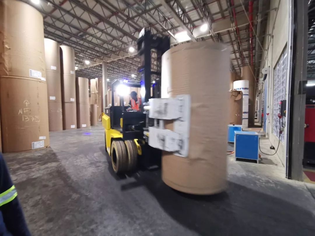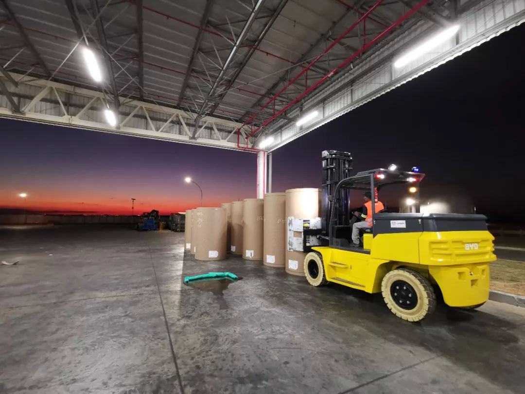 视频中一位叉车司机正操作比亚迪叉车在夜里加班作业,用安装了抱夹属具的ECB70把纸筒搬运到仓库内,以完成当天的入库工作。这段视频来自美国第二大包装公司的巴西工厂,视频中使用的叉车正是比亚迪为其量身定制的大吨位平衡重式叉车。该公司是世界最大的纸张和包装公司之一,也是美国最大公司的财富500强企业,在30个国家都拥有生产业务。目前在巴西主营的是牛皮纸(Kraft paper)和包装盒行业(Corrugated cardboard),生产量大,在搬运中多使用大吨位叉车,而比亚迪ECB70和ECB50现主要用于牛皮纸仓库作业。