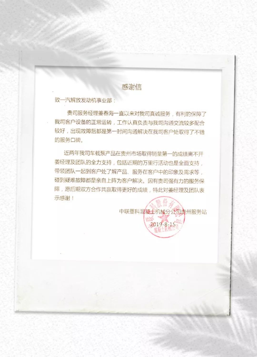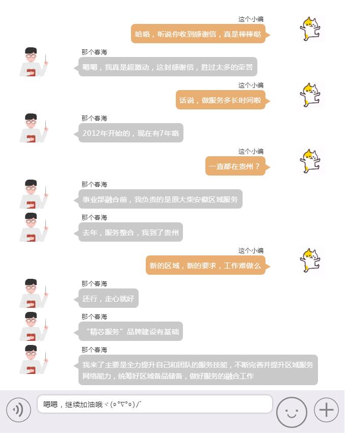 信中赞扬事业部贵州省服务经理姜春海