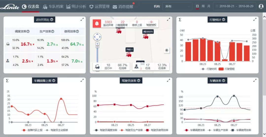 系统包含仪表面盘、车队档案、统计分析、运营管理及消息提醒五大模块。系统地为您提供包括叉车/人员效率数据及分析、安全相关数据及分析、电池使用数据及分析明细以及设备人员相关管理功能等,实时提高仓库作业效率,避免事故发生。