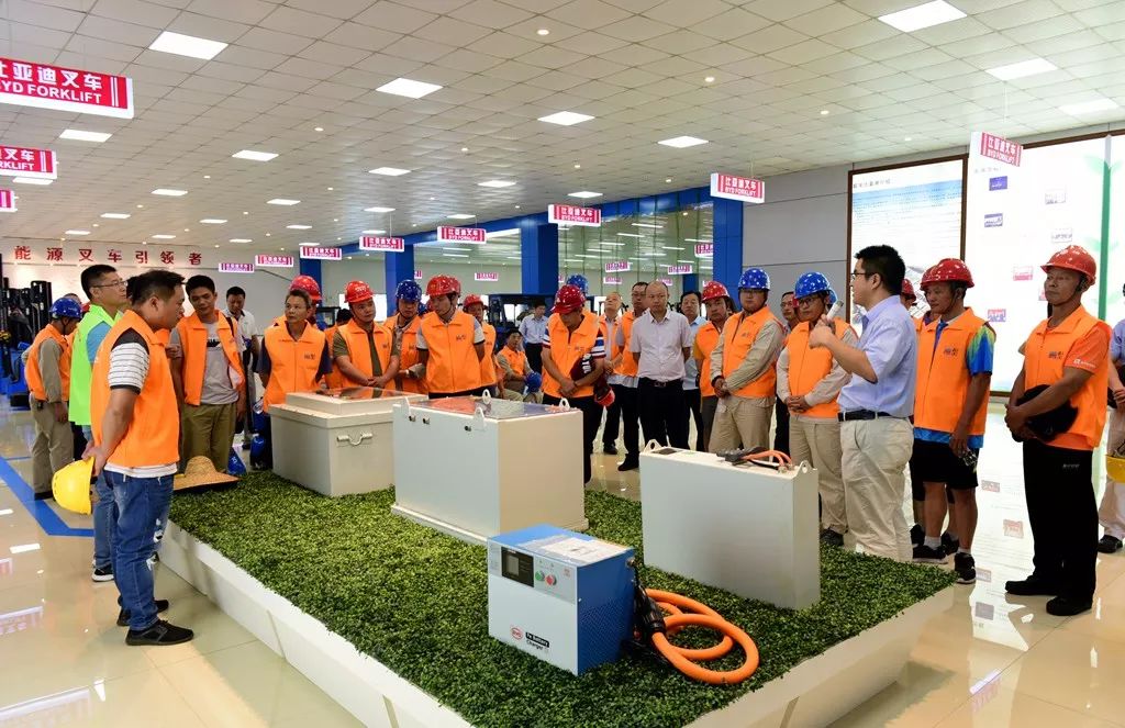与会人员饶有兴趣听取比亚迪工厂负责人做叉车电池介绍