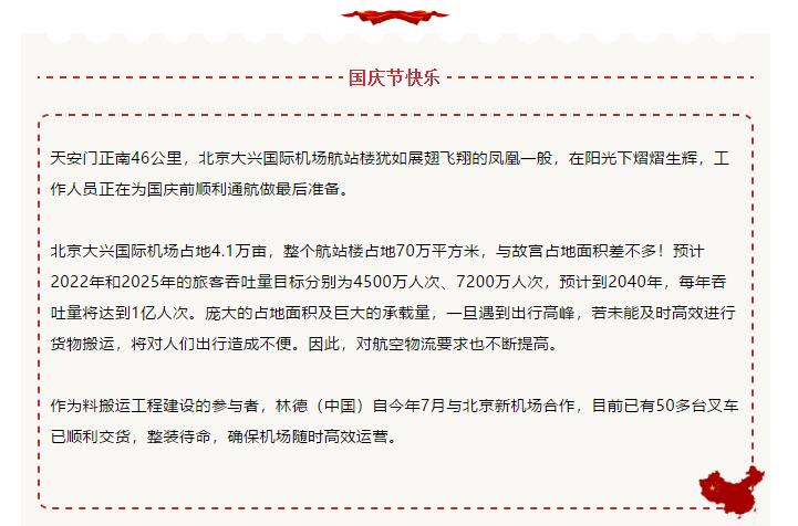 在短短的45个月中,这座机场以高效的“中国速度”如期竣工,被英国《卫报》评为“新世界七大奇迹”之首,成为北京新地标。而林德,以精益求精的态度与严谨先进的技术赶上“中国速度”,在极短的时间内顺利完成交货,全力支持机场及各驻场单位,航空公司使用,成为机场货运站装车区、货物暂存区、堆垛区等各个装卸平台的搬运主力,静待大兴机场开航。