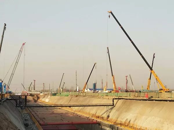 200台徐工起重机的身影高高矗立,负责地基钢架吊装、整体钢结构吊装以及地下管道的铺设