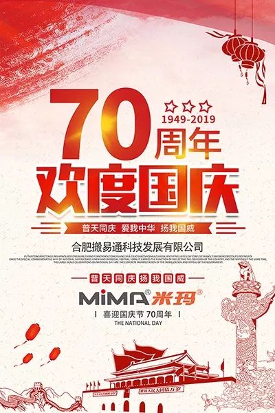 普天同庆 爱我中华不忘初心,方得始终!始终坚持以“量身定制,为你而制”为品牌核心;“物尽其用,货畅其流”为企业理想的合肥搬易通米玛电动叉车紧跟时代步伐,坚持客户至上,致力于成为一站式仓储物流专家,以更加卓越的设计理念和最新的研发技术祝福祖国70华诞生日快乐!