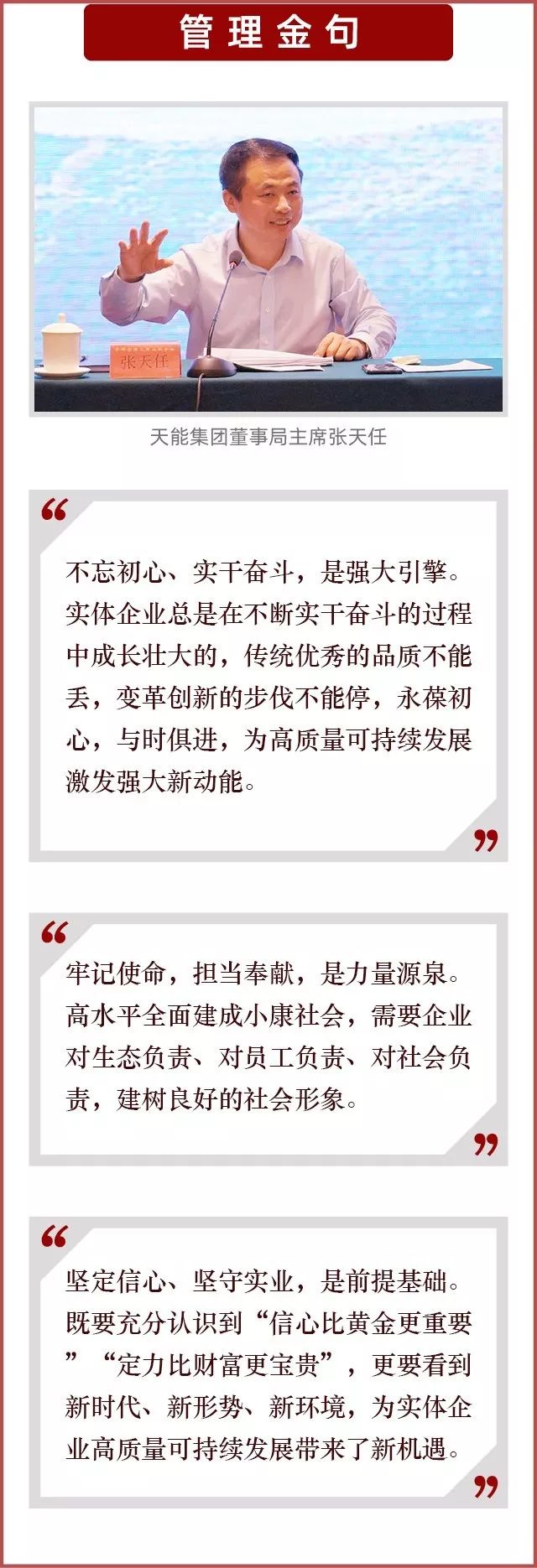 今年,全国人大代表、全国工商联执委、天能集团董事局主席张天任作为创业导师,应邀到北京为全国工商联第四期民族地区小微企业经营者培训班授课。在近2个小时的课堂里,张天任主席理论联系实际,倾囊相授分享了天能集团成立33年以来的管理箴言以及企业高质量发展的经验做法,张天任主席的管理理念饱含经营哲理,令人深受启发。小编摘选其中部分“管理金句”与大家分享,以下是张天任主席的精彩观点。