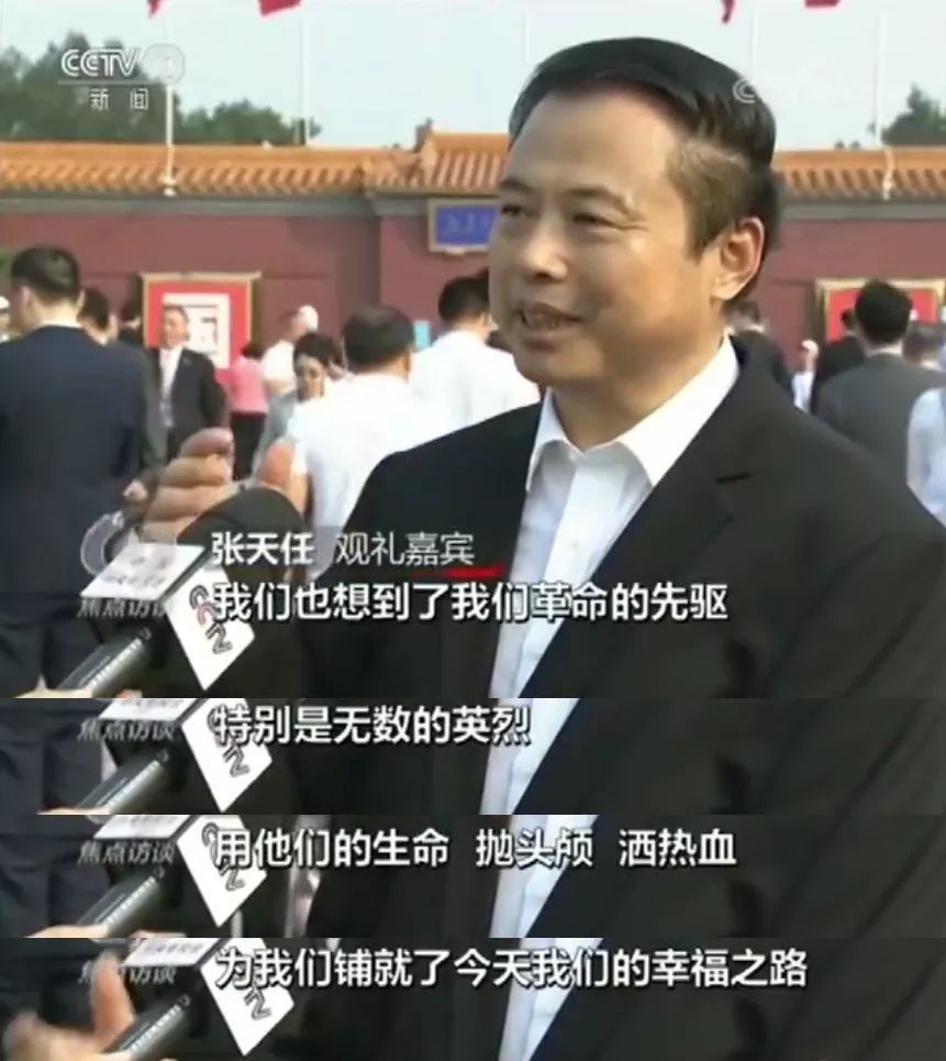 当央视记者提问观礼过程中有哪个环节、场景最打动时,张天任董事长说,“印象最为深刻的是阅兵仪式上的致敬方阵,坐在礼宾车上的都是老一辈国家建设者、新中国成立前参加革命工作的老战士、军队退役英模、民兵英模和支前模范等代表和亲属,这让我想到了我们革命的先驱,特别是无数的英烈,用他们的生命,抛头颅洒热血,革命先烈为我们铺就了今天的幸福之路。今天,我们要为中华民族的强起来而撸起袖子加油干,奋力拼搏。”
