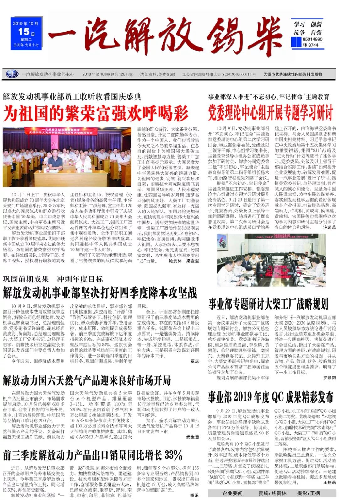 2011年锡柴进入第四次创业的新征程,提出了建设具有核心竞争力的“自主锡柴、实力锡柴、和谐锡柴”的奋斗目标。工厂正以“争第一、创新业、担责任”为核心理念,开拓创新,昂扬奋进,打造“民族品牌,高端动力”,为推动一汽自主事业,促进汽车工业又好又快发展,实现人·车·社会和谐发展做出新的贡献。