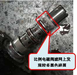 为了排除控制系统因素,先检查变速箱控制阀上的档位电磁阀。拆下电磁阀发现在比例电磁阀的滤网上有黑色碎屑,疑似变速箱内部档毂摩擦片材料。