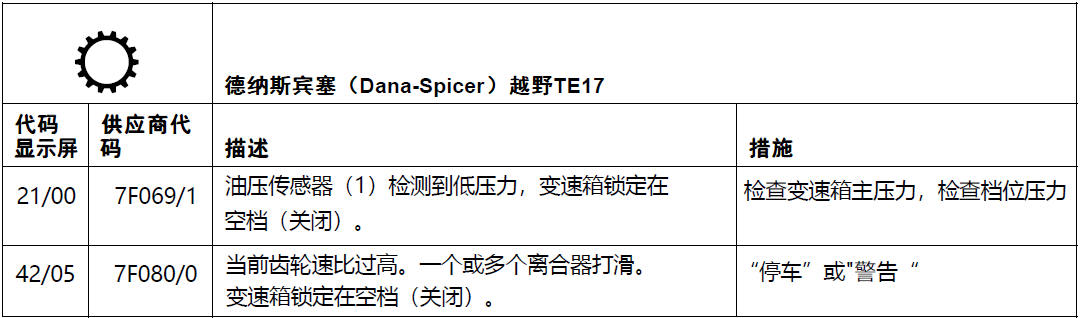 一台DCT80堆高机(配置DANA TE17变速箱),冷车作业时正常,工作10分钟热车后,机车在倒档时出现故障代码21/00和42/05,变速箱锁在空档无法行走。