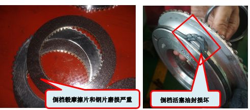 将变速箱油排出到干净的油桶,发现放出的变速箱油上有很多黑色的粉末,可以判断变速箱内部档毂磨损。进一步吊下变速箱,拆解后发现倒档毂内磨擦片磨损严重,间隙过大,倒档活塞都脱出,活塞油封损坏。