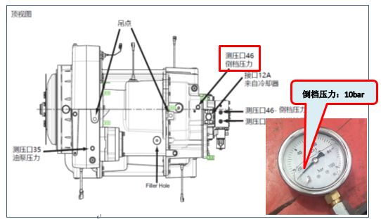 根据机车的故障现象,只有在倒档时才出现以上故障代码,而在前进档工作是正常的,可以初步判断变速箱系统压力正常,但现场仍然使用外接压力表测量变速箱系统压力,显示26bar,在正常范围内。