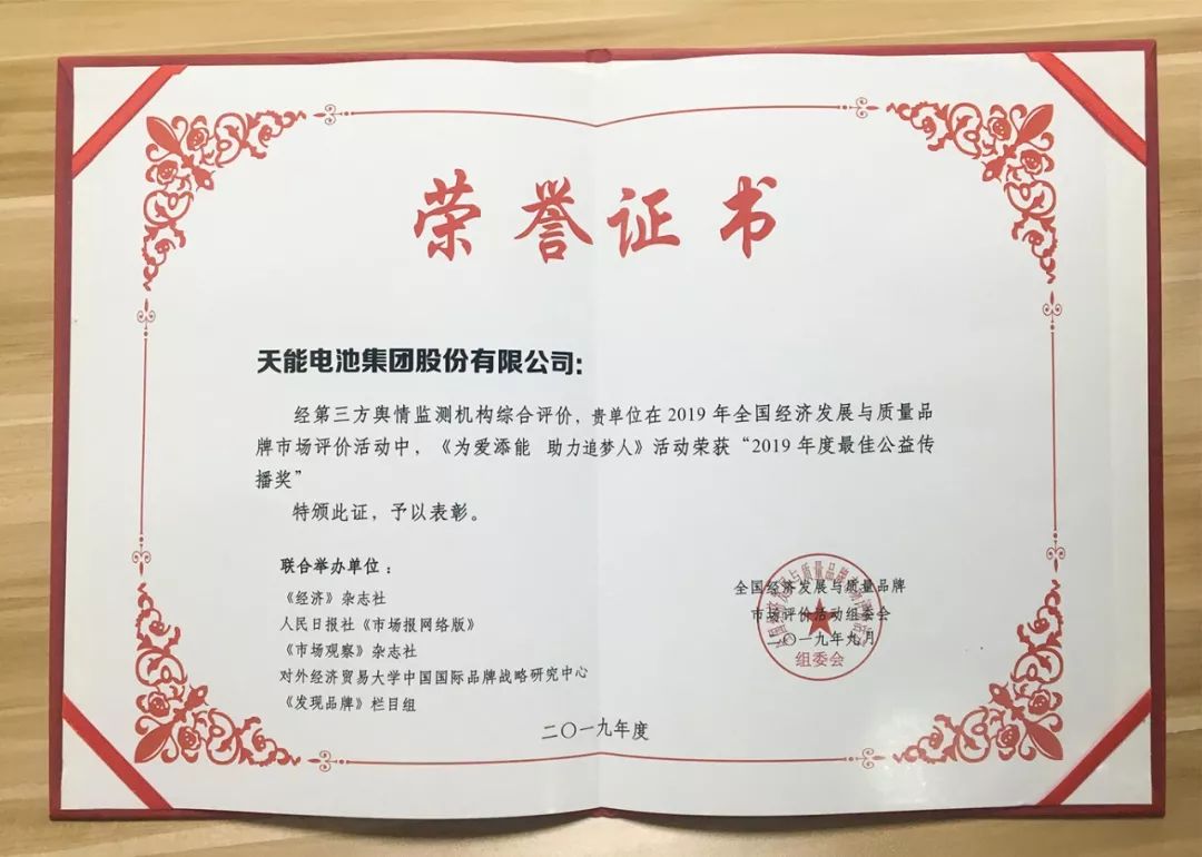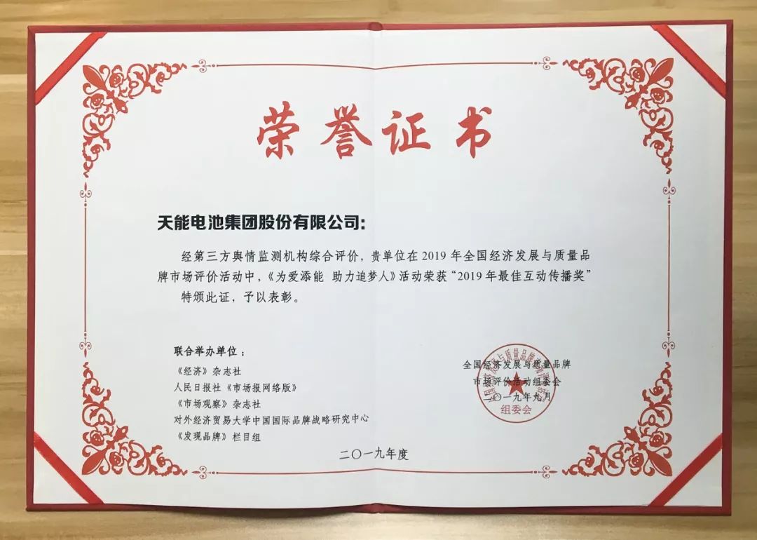 2019年5月,由天能主办,并联合爱玛电动车、支付宝、猛犸充电、辐轮传媒共同举办的“为爱添能,助力追梦人”-邀请全民参与瓜分10亿的大型惠民活动正式启幕,本次活动的亮点,通过近400列列车向亿万群众进行传播,向广大消费群众送福利,真正做到为爱添能。