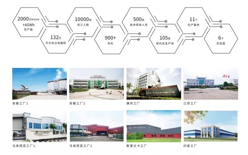 在国内广东、江苏、安徽和国外马来西亚、斯里兰卡、印度、越南建有14个区域性生产基地,占地面积130万平方米,共有员工15000余人,其中技术研发人员近500人。拥有105条电池生产线及相应的检测设备,年生产能力总和超过2160万千伏安时。企业在美国、 欧洲、亚太等地成立有海外销售公司及仓库,以及国内近50个销售公司和办事处,产品销往全球110多个国家和地区。