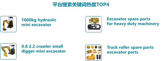 在60%的整机出口中,挖掘机最为引人关注。国际站的数据显示:工程机械行业搜索关键词TOP4中,挖掘机(Excavator)整机的搜索总量排名第一、占整体流量的22.22%,且搜索频率保持158%的增长速度。挖掘机因其用途广泛,在国内外的销售量均占据榜首。在阿里巴巴国际站平台上,1000kg液压小型挖掘机、重型机械挖掘机备件、0.8 2.2履带式小型挖掘机、履带支重轮备件挖掘机零件分列行业热品的前4位,挖掘机的整机和配件都占据了市场聚焦点。