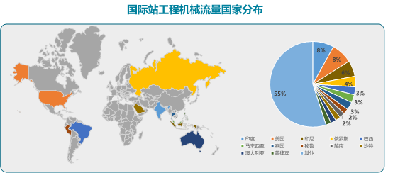 阿里巴巴国际站平台数据已显示出这一上升趋势:2019年前7个月,工程机械行业询盘买家数平均增长45%,订单数平均增长127%。工程机械行业出口以整机出口为主,占总体出口额的60%,零部件出口占比40%。整机出口主要流向新兴的发展中国家,如印尼、俄罗斯、菲律宾、泰国、土耳其等;零部件主要流至发达国家,如美国、日本、澳大利亚、韩国、英国等。