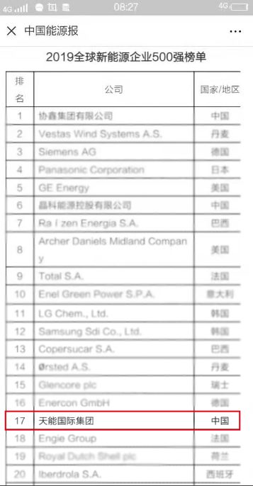 “500强”企业主要分布在全球37个国家和地区,涉及太阳能、风能、地热能、储能、潮汐能、海洋能等产业企业,评价方式采用国际通行方式,以能源企业上一年度营业收入为评价标准。值得一提的是,在本届榜单中,中国入围总数为209家,天能与协鑫、晶科一同位列中国企业前3甲。
