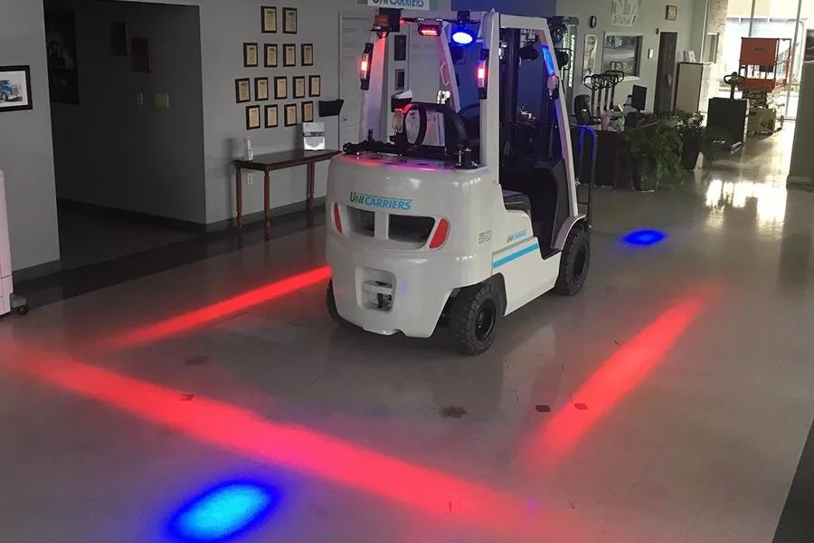 可安装叉车灯(车载警示灯、叉车一字灯、叉车蓝光灯),叉车启动时,发出语音和灯光提醒:叉车,请注意!叉车,请注意!提醒行人避让叉车。