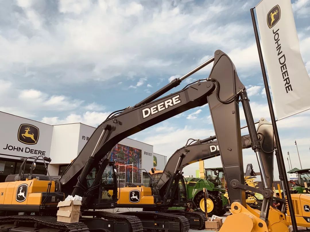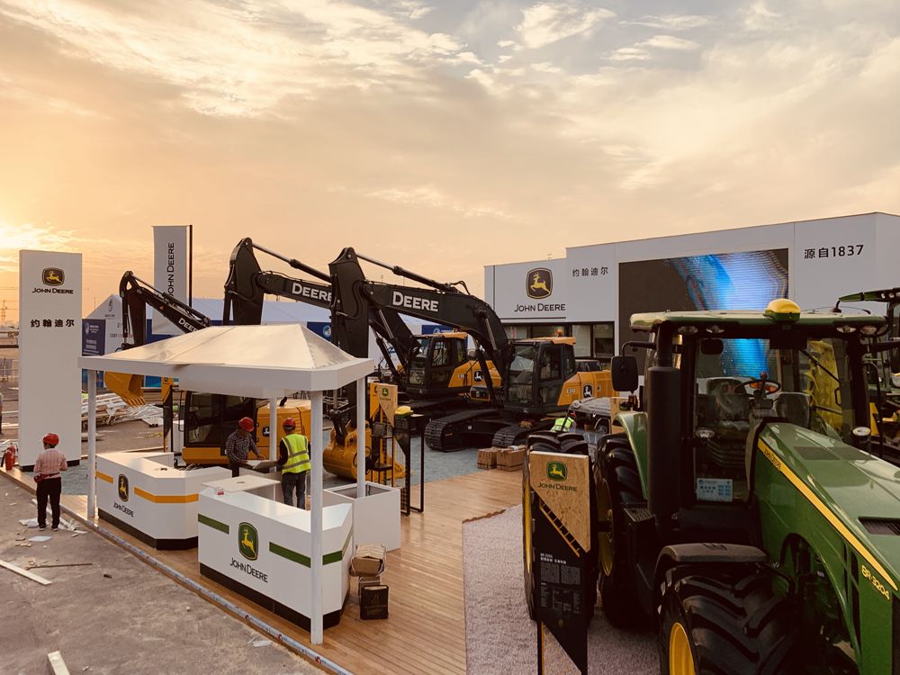 展会现场,约翰迪尔带来三台挖掘机、青贮机、8R拖拉机、多功能车、球道剪草机、约翰迪尔发动机及零件。