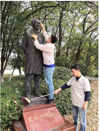 前瞻技术党总支先进动力党支部践行党员责任,将“史绍熙先生塑像”石碑和塑像上的鸟粪与灰尘清洗干净。