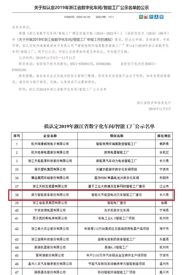 日前,浙江省经济和信息化厅在网站发布公示文件,诺力股份四期工厂——智能化节能型电动叉车智能工厂被评选为“2019年浙江省智能工厂”,正式盖上“官方认定”红章,从此官宣。