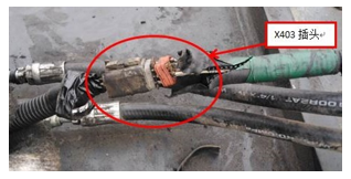 进一步检查吊具右侧传感器线路和插头,发现吊具上的X403插头损坏,插头针脚有进水短路的痕迹。