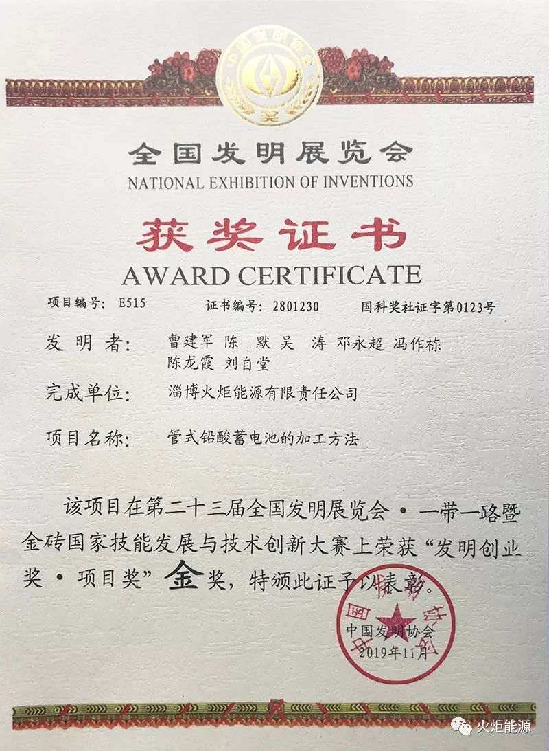 近日,火炬能源公司推荐的《管式铅酸蓄电池的加工方法》发明专利荣获集团公司发明专利实施奖二等奖。