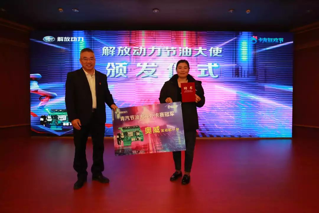 在刚刚结束的第二届青汽节油赛中,作为女卡友,韩红梅驾驶着搭载解放动力奥威发动机的解放JH6,凭借着百公里29.83L的油耗,取得了骄人的成绩,以绝对的优势斩获了外卡组冠军。现场特为她颁发了“节油大使”聘书。