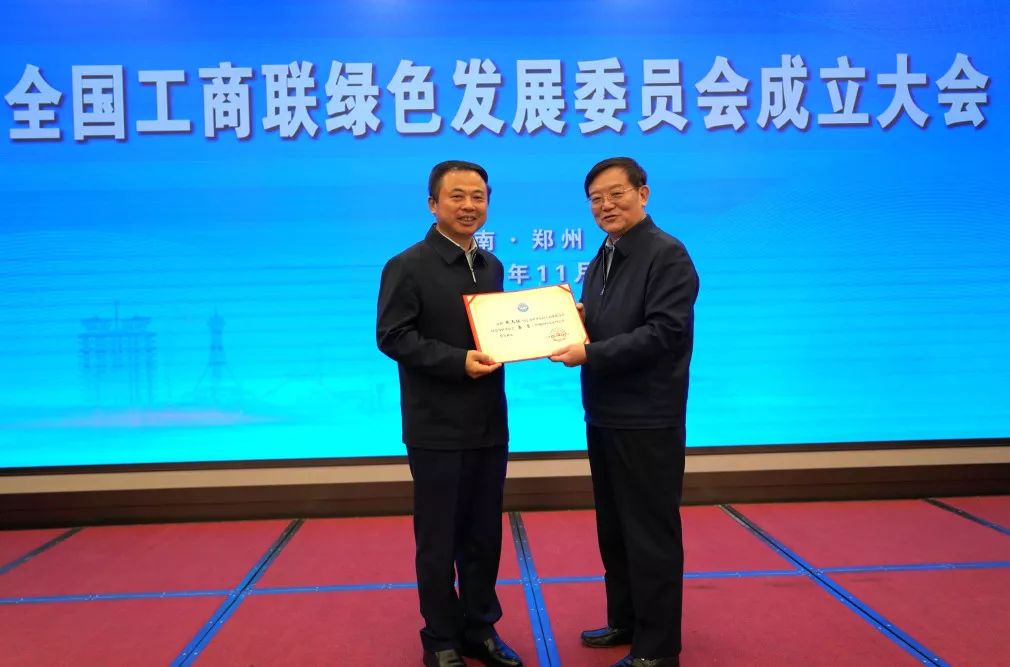 11月14日-15日,全国工商联绿色发展委员会成立大会和支持服务民营企业绿色发展交流推进会在郑州举行。全国工商联执委、浙江省工商联副主席,天能集团董事局主席张天任被聘为“中华全国工商业联合会绿色发展委员会委员”,中央统战部副部长,全国工商联党组书记、常务副主席徐乐江为张天任主席颁发聘书。