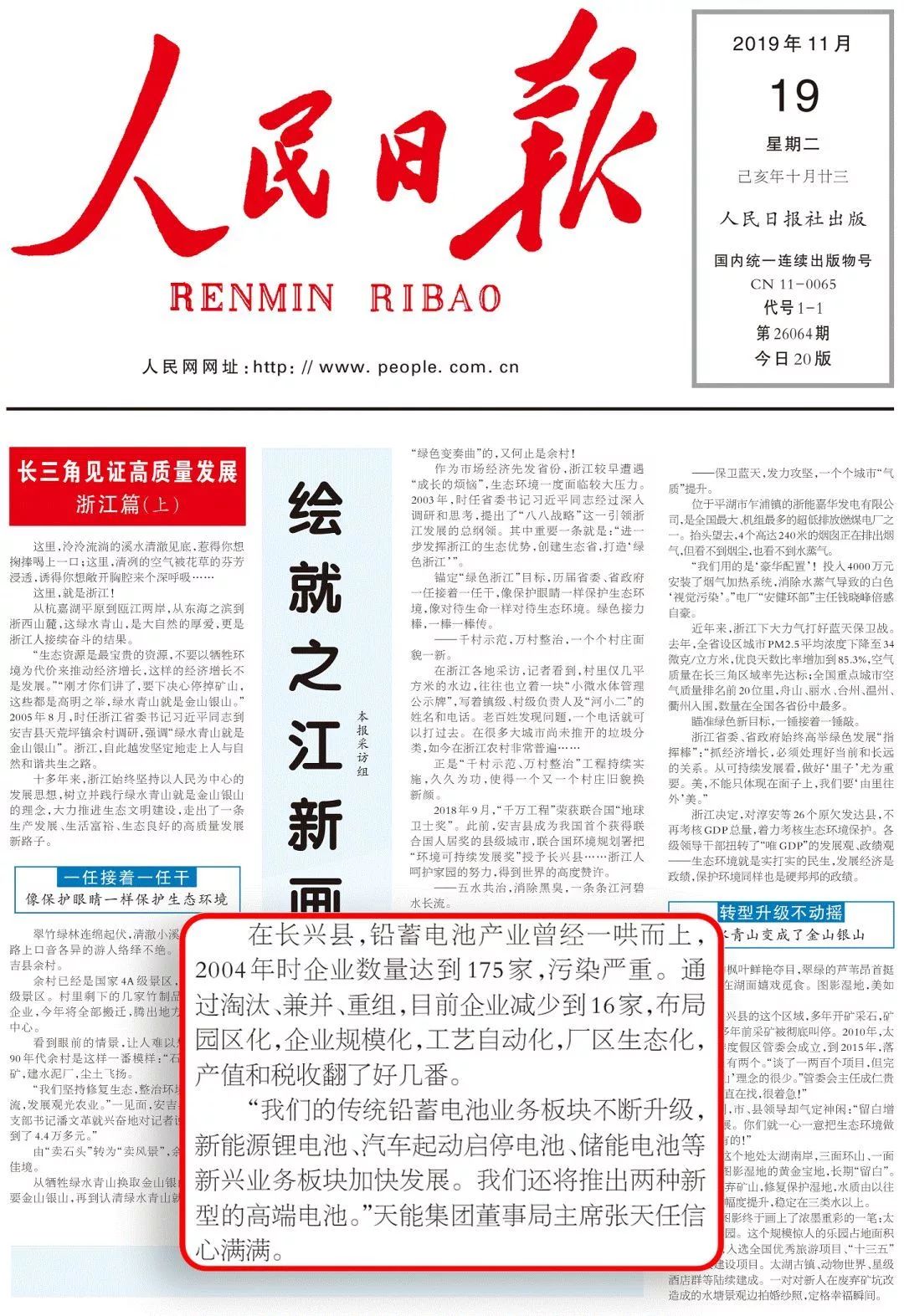 11月19日《人民日报》聚焦浙江高质量发展,头版头条刊发了题为《绘就之江新画卷(长三角见证高质量发展·浙江篇(上))》的专题报道,点赞了天能践行“两山”理念,加快推进产业转型升级,走绿色发展的新路子。