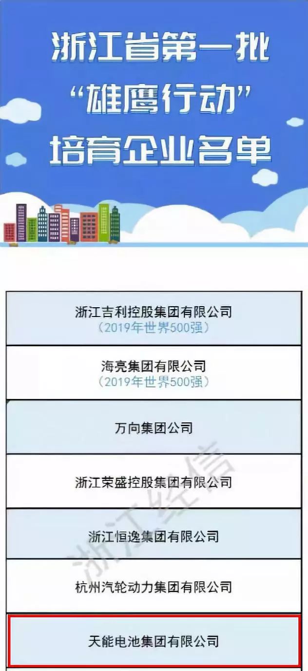 近日,浙江省工业转型升级领导小组公布第一批“雄鹰行动”培育企业名单,天能与吉利、万向等千亿级企业一同上榜。