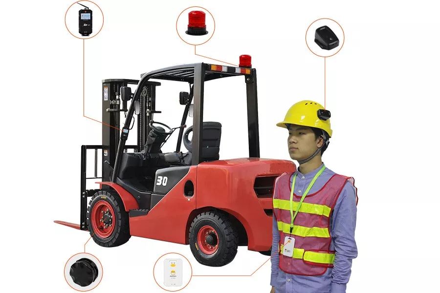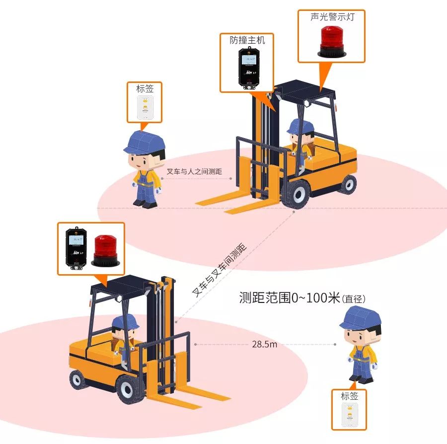 叉车防撞报警系统是专为预防叉车事故而进行开发的专用软件;为了防止和减少以上危险因素与安全隐患情况的发生,在作业车辆上安装车载测距基站,同时在进入作业车辆工作区域的人员身上佩戴上防撞标签,测距基站实时监控150m(可手动调节远近)半径范围内防撞标签的相对距离(精度达到10cm),当人靠近危险范围时,触动作业车辆上方的测距防撞报警器,从使车辆上方的语音报警装置发出报警,提示操作员有人靠近,请远离或停止操作。有效预防、杜绝叉车碰撞碾压员工等高危事故发生。叉车防撞预警系统是世界领先的高精度距离防护系统,其最高测距精度可达10cm.本系统包括:l 车载微基站,安装在作业车辆上;l 电子标签,佩戴在作业人员安全帽上;l 报警器(Alarm),发出语音报警示声音,防止行人靠近;l 连接线缆(Wire),连接系统的各个部分;在叉车防撞预警系统中,主机实时测量和更新与标签之间的距离。当主机与标签之间的距离小于“报警距离”时,主机将驱动报警器进行报警,警示行人远离危险源。典型应用如下图所示。