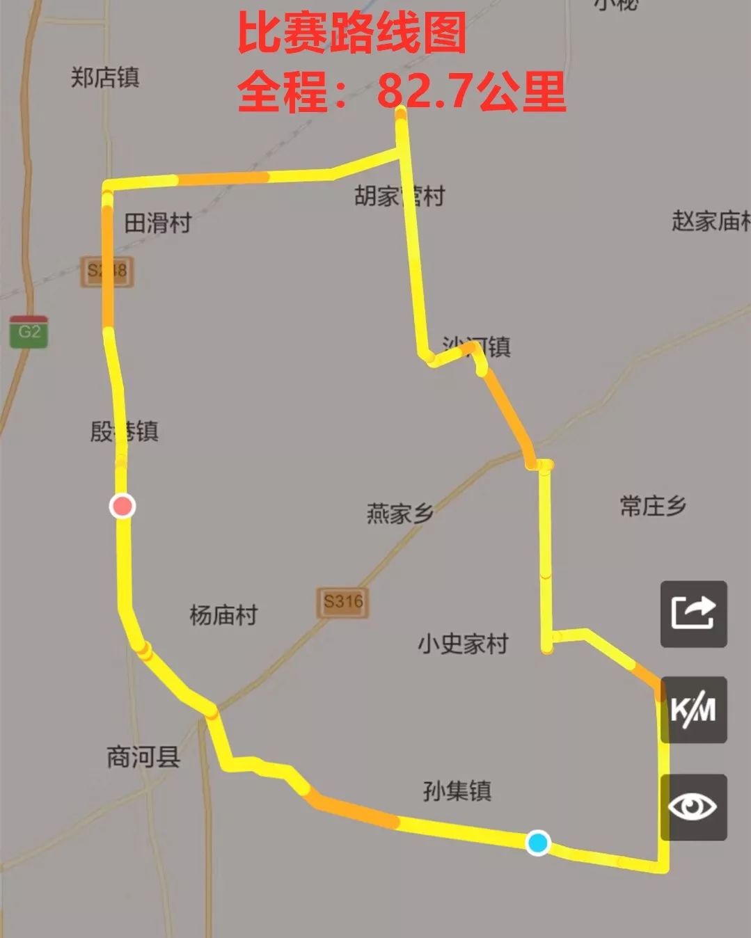 本次比赛从理士MSB电池商河经销处出发,途径商河县城——孙集——郑路——三官庙——龙桑寺——沙河——胡家营村——田滑村——殷巷,最终返回理士MSB电池商河经销处,全程82.7公里。