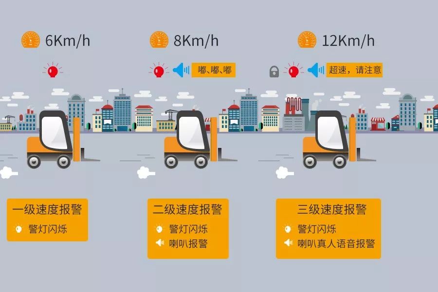 叉车超速报警器的强制限速并报警功能:当车辆超速时,会记录当前司机违规超速,并强制限速。两级超速报警,一级警灯报警,二级喇叭报警。从而保障车辆和人员的行车安全。
