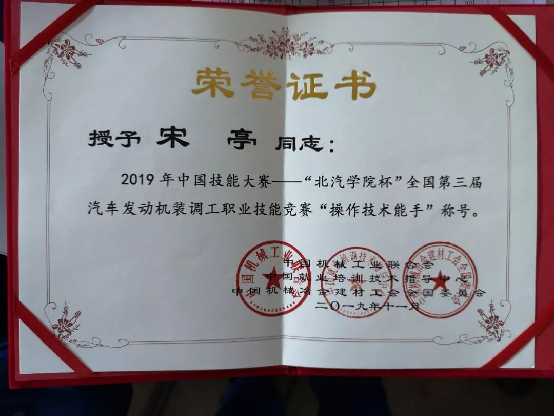 这次全国第三届汽车发动机装调工职业技能竞赛创造了参赛人数最多、发动机机型最多、考试难度最大的“三最”纪录。面对全国顶尖技术能手,宋亭表现出了过硬的专业技能和稳定的心理素质,在发动机装调、排查故障、理论考试等环节都取得了好成绩,引得了评委的认可和竞争对手的尊重。