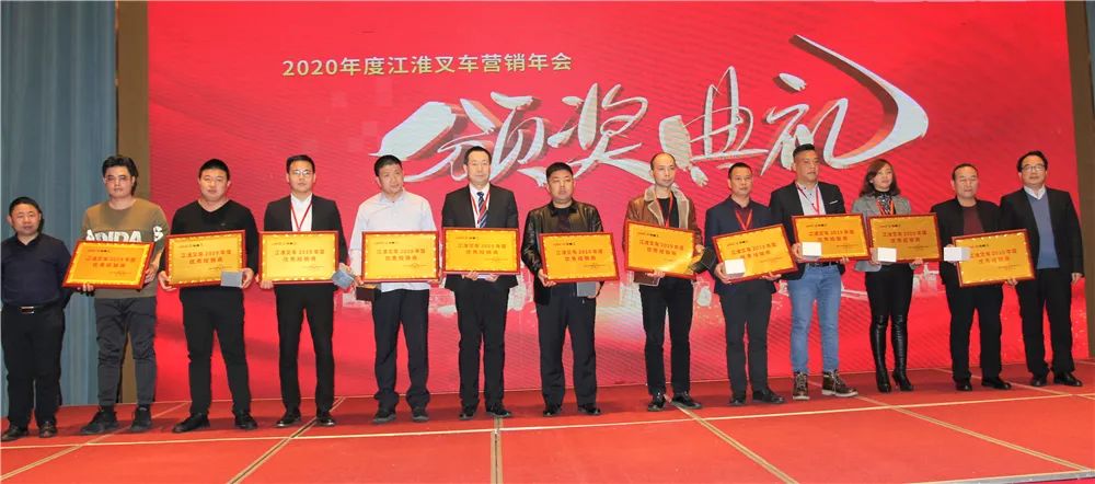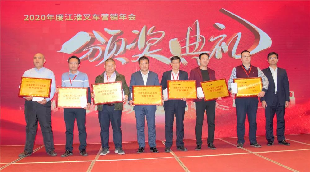 江淮重工公司董事长王德龙先生携高层领导分别为2019年表现突出的经销商颁发奖牌和奖品。