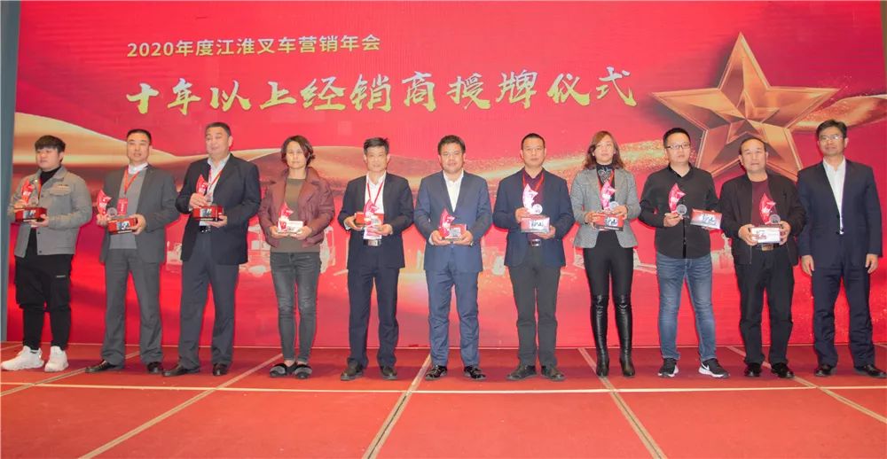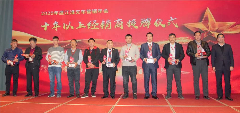江淮重工公司积极倡导和建立“一家亲”的经销商家人文化氛围,为了感谢合作十年及以上的家人鼎力相助,本次年会特别设立合作十年及以上经销单位授牌仪式。