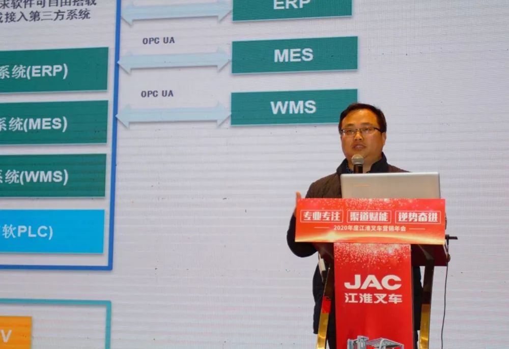 江淮重工公司总经理助理王福松先生分享江淮叉车AGV产品在一些实际工况应用场景和AGV相关的知识,同时与代理商探讨如何销售AGV产品,引起现代理商极大的反响。近几年,江淮重工致力于实现由物流搬运设备制造商向智能仓储物流整体解决方案提供商的转变,王总助建议经销商要高度重视,积极拓宽AGV产品的销售渠道。