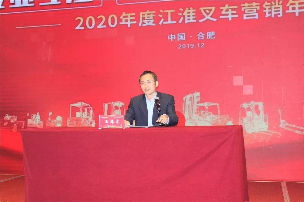 “各位经销商和江淮重工之间是相互信任、相互尊重、相互理解、相互支持,共同成长,目标也是一致的,坚持以客户为中心,坚持质量为本,做求真务实的创业者、奔跑者和追梦人。”江淮重工公司董事长王德龙先生在讲话中高度评价了江淮叉车经销商。王董事长首先结合工业车辆行业现况深度解读了江淮重工2019年度的经营数据,指出江淮重工一定要把握好市场发展的趋势,坚持创新为第一动力,在结构调整上下功夫;坚持体系管理,在经营能力上下功夫;坚持文化引领在持续经营上下功夫;坚持强化品质和成本,在客户的价值上下功夫。接着从中央政策的角度分析国内经济形势的变化,指出2020年会有好转,民营企业的经营环境会改善,对工业车辆行业有利好的一面。最后他与经销商分享如何带好团队如何培育人才的经验,并用江淮集团管理领导干部的24个字:“敬业、创业、奉献、勤政、自律、团结、学习、思考、修炼、开拓、进取、创新”勉励经销商。