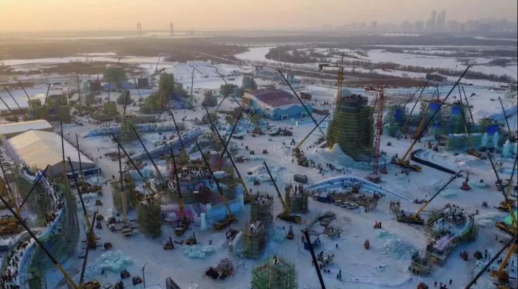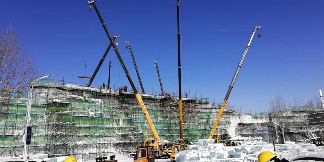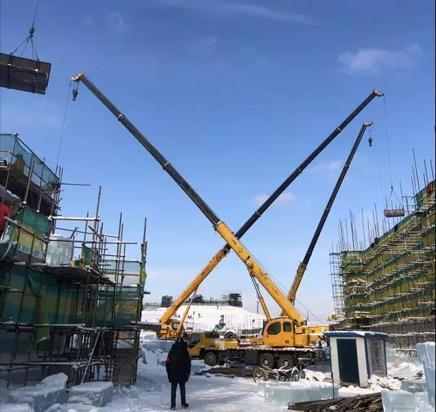 据了解,第21届哈尔滨冰雪大世界在2019年12月初开始取冰造景,无数块长1.6米,宽0.8米,高0.5米,重达一吨的冰块被源源不断运送至施工现场。本届,XCT25、QY25K5-1、QY70k-1在内的50多台徐工起重设备现场效力。