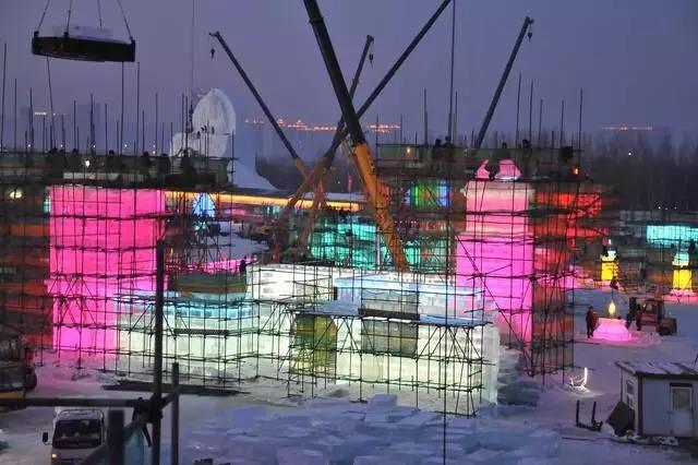 更关键的是,冰雪大世界的建筑,是世界停留时间最短的建筑也是独一无二的无以复制的建筑,后期最多持续三个月。因此从符合冰冻条件开始,上万人将在这里开始有序的无缝链接工作。就起重环节来看,程序简单却作业频繁,平均每五分钟吊一块冰。早六点到晚六点,每天12小时持续工作,一天24小时全程驻场。