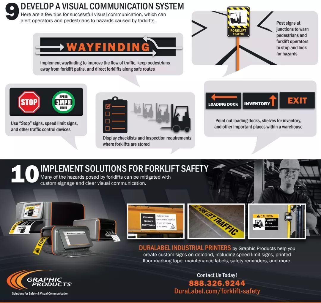 定制标志和清晰的视觉传达可以减轻叉车带来的许多危害。Graphic Products(图形产品:安全和视觉传达解决方案专家)的DuraLabel工业打印机可帮助您根据需要创建自定义标志,包括限速标志、印刷地板标记胶带、维护标签、安全提醒等。