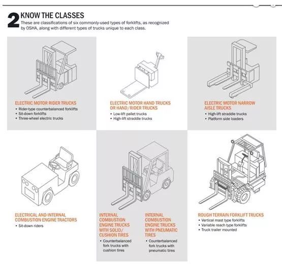 这些是OSHA认可的六种常用类型的叉车的分类。
