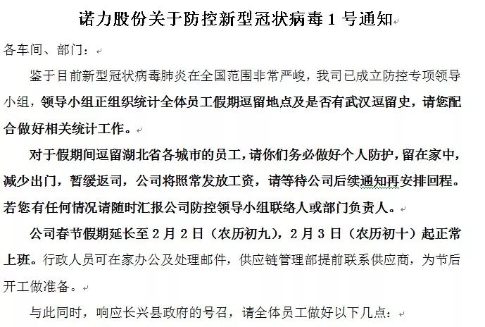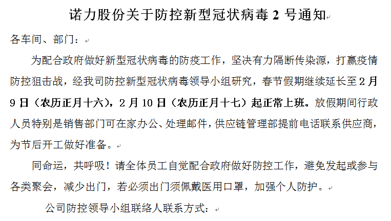 诺力股份最早于除夕启动防控工作,并于1月27日成立了防控新型冠状病毒领导小组,由董事长丁毅亲自担任总指挥。丁董事长强调,"同呼吸,共命运",要把防控工作提高到关乎员工生死存亡的高度,提前部署,提前落实。领导小组每天召开多次电话会议,部署疫情防控工作,并根据国家决策,多次下发通知,保证防疫工作有效展开。